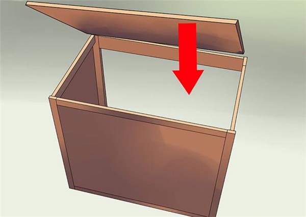 ۸. کنارهها را به قسمت تحتانی متصل کنید. قسمتهای کناری را با استفاده از چسب و گیرههای مفصلی به سازهی تحتانی متصل کنید. اطمینان حاصل کنید که تمامی لبهها همتراز هستند. انبرک و وسایل مربوط به اندازهگیری زاویه میتواند در این خصوص به شما کمک کند.